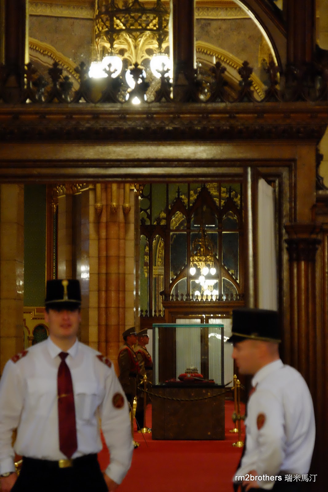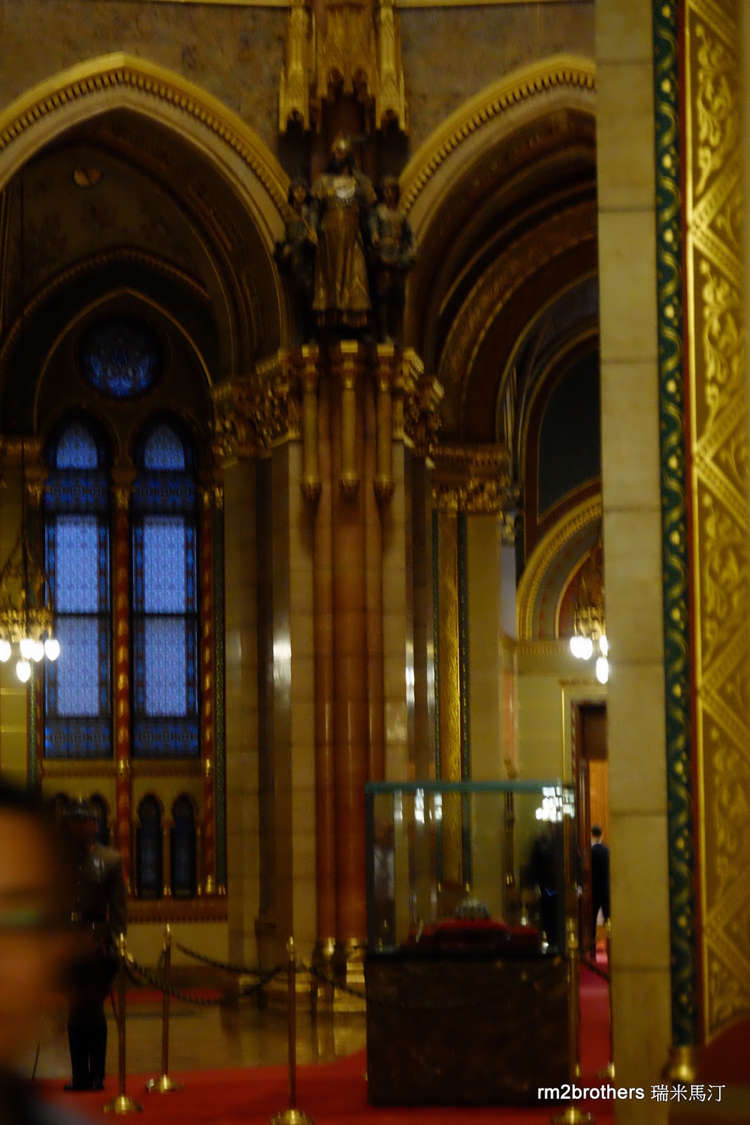 接下來我們進入上圖警衛後方的 Dome Hall 圓頂廳,因為裡面禁止拍照,所以只能從外面拍到比較遠的照片。那中央的玻璃櫃保存著歐洲最古老加冕典禮中的皇冠和勳章,是匈牙利的國寶,匈牙利國徽上方描繪的正是這頂皇冠,由武裝士兵24小時在一旁看守著,而圓頂聽的周圍有著歷代匈牙利統治者的雕像。