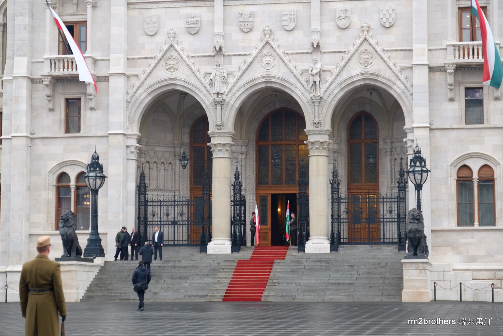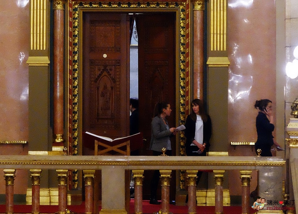 而入口處正上方的房間,看起來有一群人正在開會,原來此時波蘭總理也在裡面呢!難怪國會大廈的正門口懸掛著匈牙利及波蘭兩國的國旗啊!