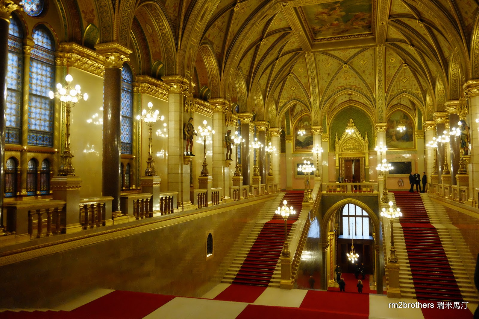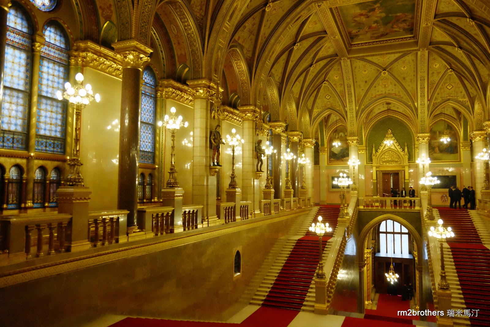 不久我們來到了匈牙利國會大廈中央的大階梯,周圍以花崗岩柱建起的大空間。可以看到牆上和屋頂的壁畫以及彩繪玻璃窗,注意看樓下的大門,是國會大廈正式的入口,也就是剛剛我們在自由廣場 (科蘇特廣場 Kossuth Square)上遠遠看到那些黑頭車上人們進入的入口呢!