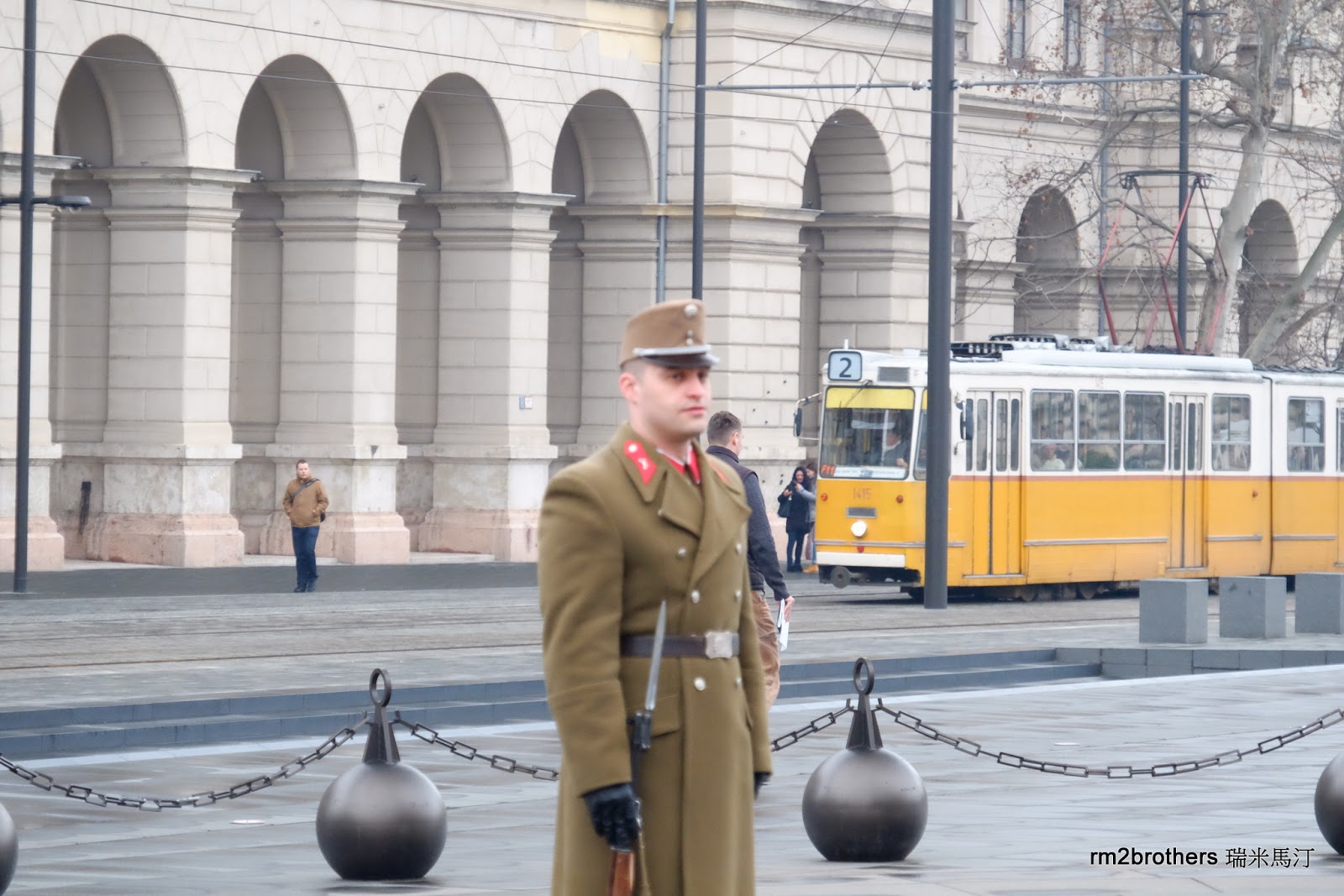 匈牙利國會大廈前的廣場稱為 Kossuth Square,通常每日 8:00~18:00 每個整點都會有衛兵交接儀式,不過我們道的那天上午廣場正被軍警封鎖著,我們一開始還搞不清楚是甚麼狀況。衛兵交接搞那麼大陣仗啊?![]()