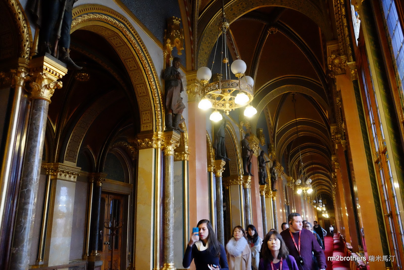 接下來我們進入上圖警衛後方的 Dome Hall 圓頂廳,因為裡面禁止拍照,所以只能從外面拍到比較遠的照片。那中央的玻璃櫃保存著歐洲最古老加冕典禮中的皇冠和勳章,是匈牙利的國寶,匈牙利國徽上方描繪的正是這頂皇冠,由武裝士兵24小時在一旁看守著,而圓頂聽的周圍有著歷代匈牙利統治者的雕像。