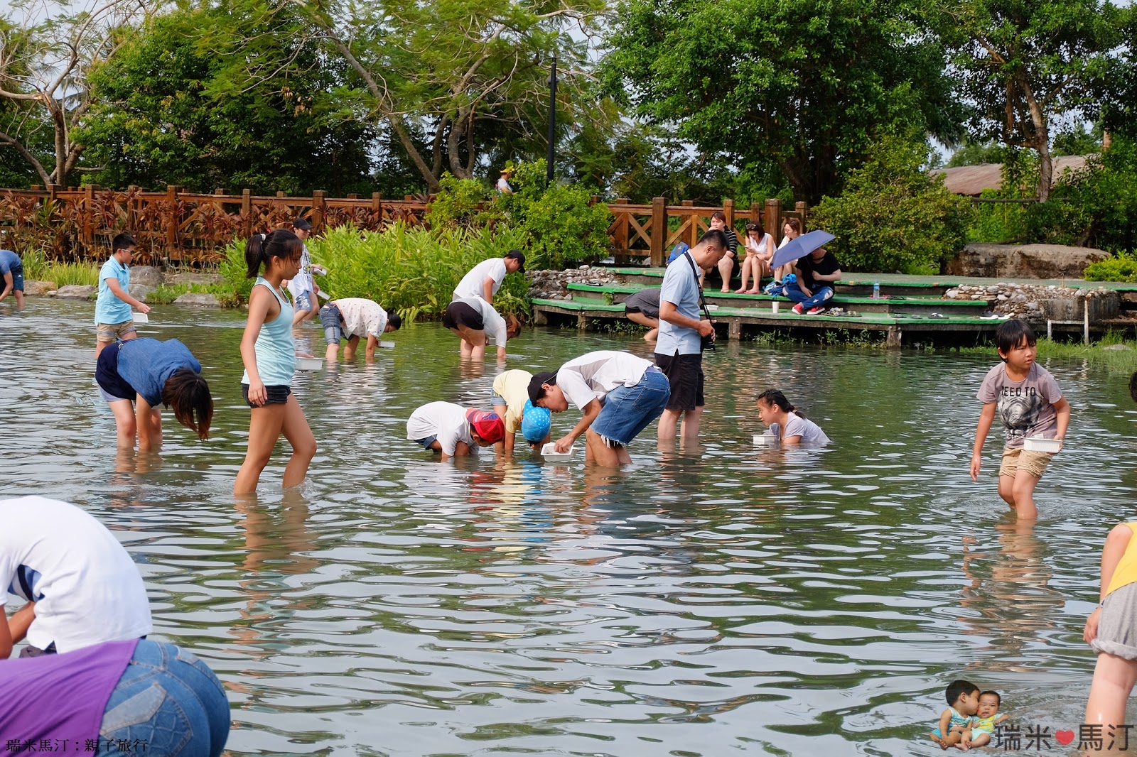 體驗池的旁邊很貼心的蓋了遮陽棚,家長們除了可以下水幫忙挖、幫忙照相外,也可以在岸上納涼