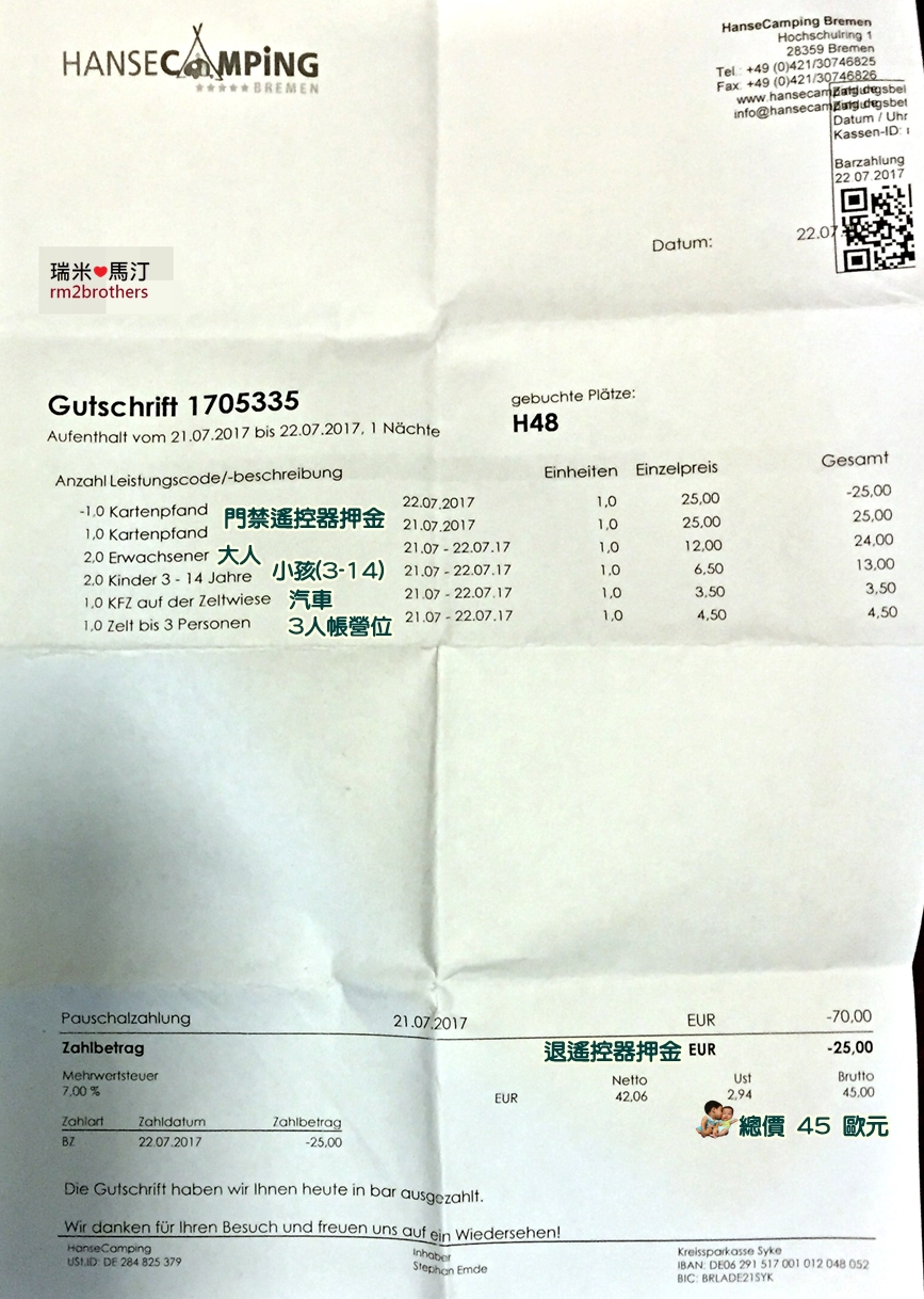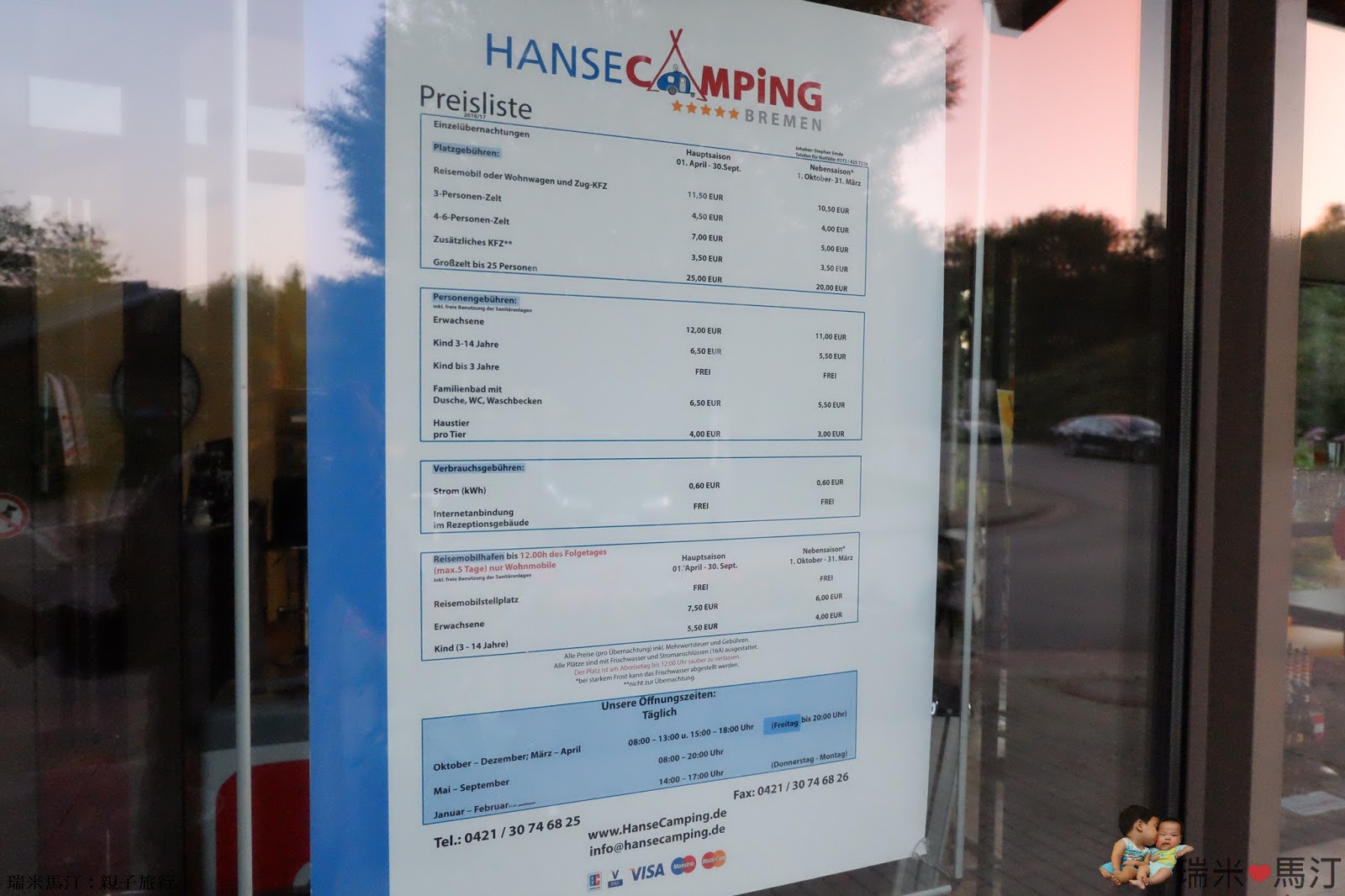 上圖是Hanse Camping 的收費表,以帳篷+人頭+車輛計費。