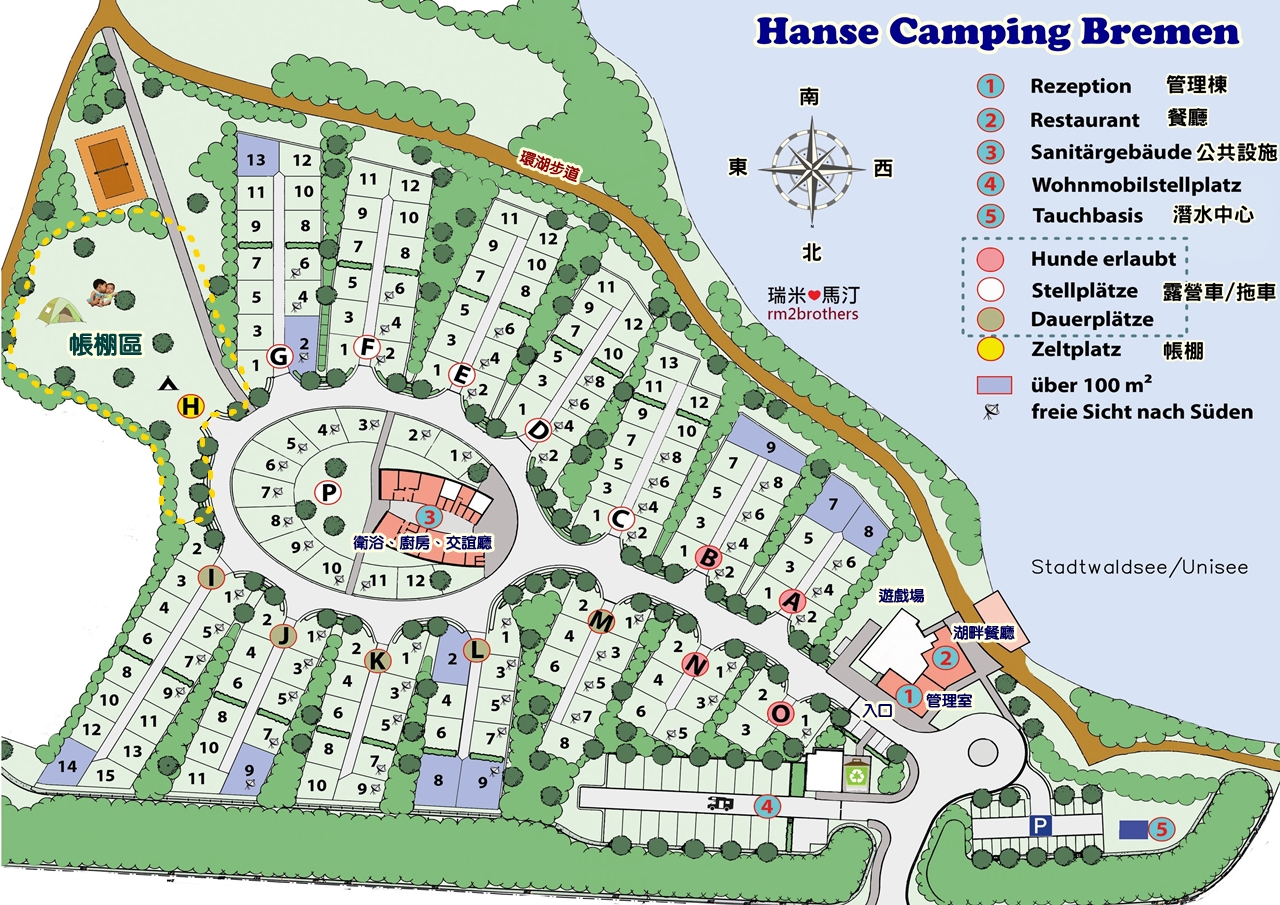 Hanse Camping露營場位於不來梅大學附近,Stadtwaldsee (Unisee)湖邊,但搭營處與湖畔隔著環湖步道及一些樹木間隔著,所以需走到步道才能欣賞湖景。此湖邊有專門戲水的淺灘(beaches)、甚至還有潛水學校(pits diving center),但早晨及傍晚氣溫較低我們並沒有下水。