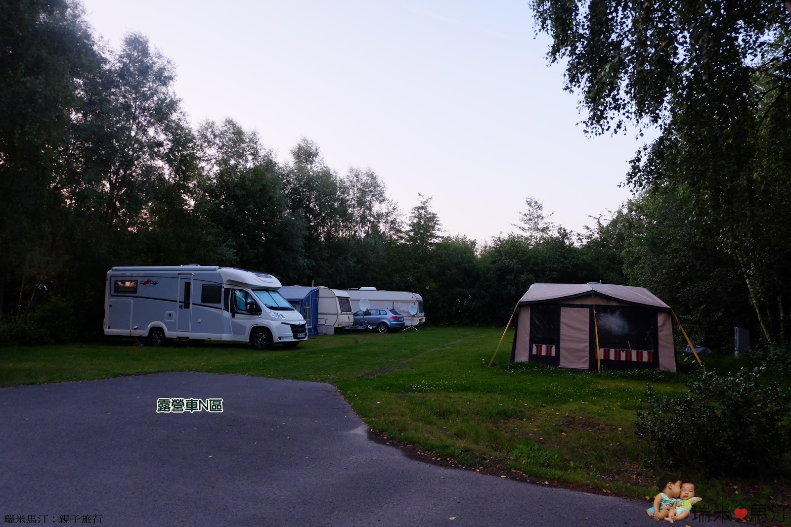 我們這次帶的是雙峰帳,因為高度的關係看起來特別大。歐洲的收費露營場八成都是露營車營位,只保留一小塊是帳棚營位,當然你也可以搭帳篷在露營車營位但是價格較高喔。Hanse Camping 的帳篷營位就是一塊大草皮,先到先搭,自己找空位搭帳,自己找空位停車,完全沒有劃線。