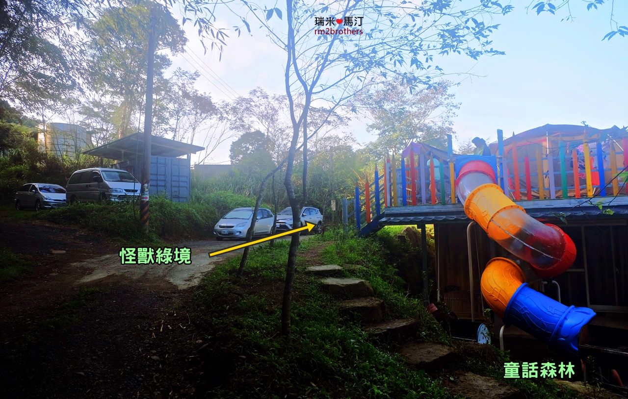 早到最後快到終點時,會看到一個 兒童遊戲場 露營區,有漂亮的房子、圍籬和溜滑梯,還有一個滑水道呢,感覺是一個非常吸引小朋友的地方,但缺乏景觀、腹地稍小!這露營區叫作童話森林,我們要去的怪獸綠境就在旁邊了。