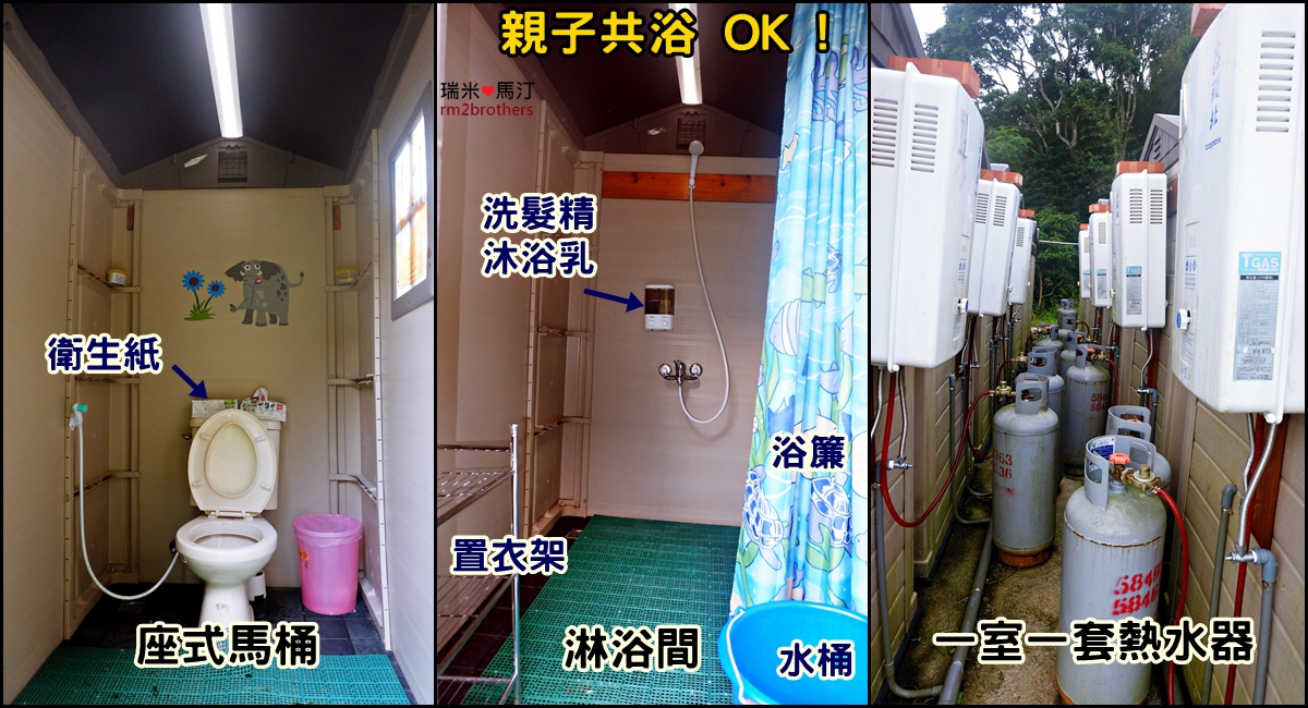 不過在經過實際使用之後我真的要告訴大家,這不是流動廁所啦!這空間大很多而且使用起來比一些營地的衛浴還棒,乾淨明亮無異味空間大親子共浴沒問題。還有提供衛生紙、沐浴用品、置衣架、水桶等,唯一的缺點就是沒有吹風機啦!