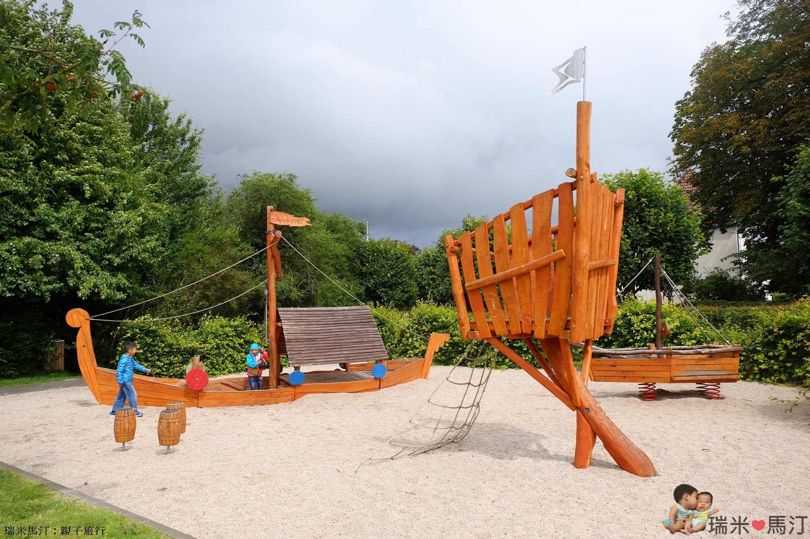 由於怕不好停車不敢將車開進城鎮中心,歐洲很多小鎮都不大,車子停在週邊走進去比較安心一點。我們繞著Ribe小城,很容易在週邊找到免費的停車格,丹麥的免費停車格多半是限時的,必須在擋風玻璃前擺放清楚的停車時間。我們停車的旁邊就是一個兒童遊戲場呢。