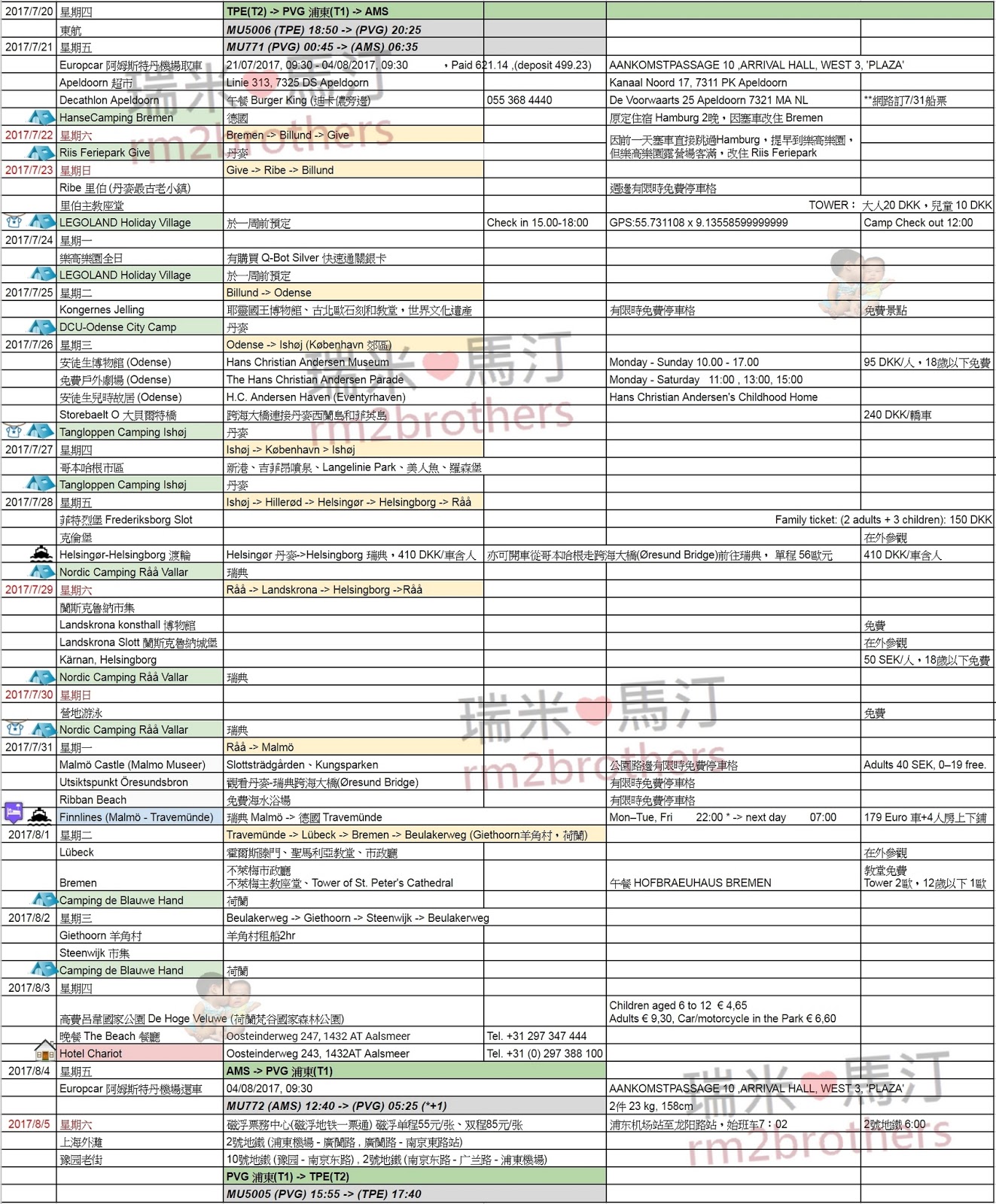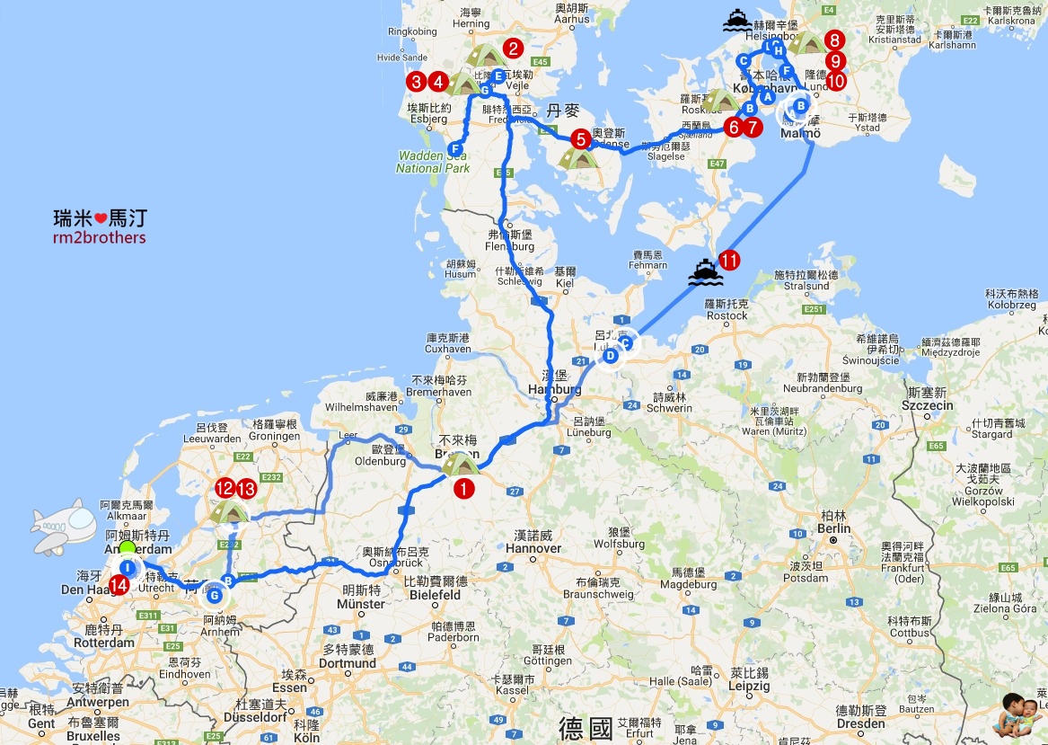 這次暑假17天的行程,於歐洲實際為14天14夜,上圖藍色英文字母為到訪的景點,而紅色數字就是這14晚過夜的地點及順序,其中包含露營 12 晚、飯店 1 晚、遊輪 1 晚,途經荷蘭、德國、丹麥及瑞典,大約開車 2332公里,加油花費台幣 9706,文末有詳細的行程表唷。