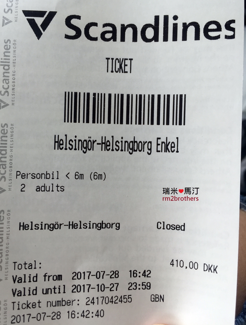 這種連車帶人不過夜的票通常都是一車輛大小算錢,然後一車的價格可以包含多少人之類的。從這裡開車搭渡輪要價410DKK,比從哥本哈根開車過跨海大橋貴一點。(從哥本哈根開車過Øresundsbroen 松德海峽大橋到瑞典Malmo單程360DKK)。