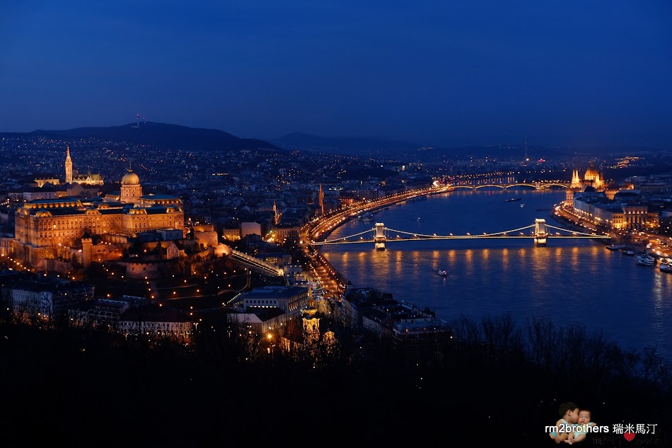 由Gellért Hill 蓋勒特山俯瞰城堡山漁人堡、Széchenyi Lánchíd 塞切尼鏈橋、以及國會大廈的無敵夜景,