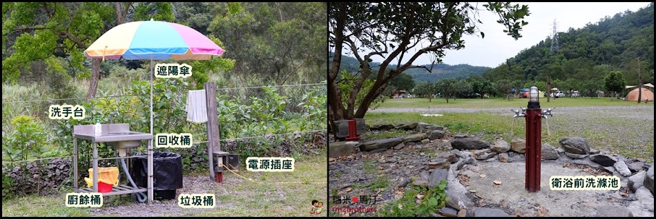 洗手台旁邊都有電源插座,而垃圾桶、資源回收桶、廚餘桶以及遮陽傘,是有人搭帳的區域,老闆會特地來設置。