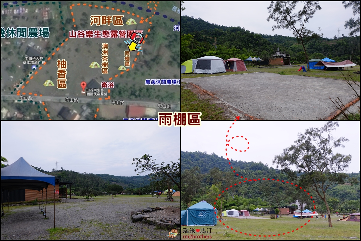 山谷樂生態露營園區隔著中山路,一邊是營本部及民宿區,另外一邊是露營區。露營區分有柚香區、澳洲茶樹區、河畔區以及雨棚區。