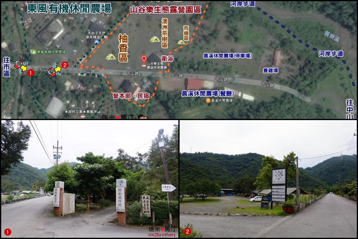 由市區經由中山路到達這個山谷,首先看到的是東風有機休閒農場,東風有機休閒農場位於小馬路的兩旁都有露營的區域。