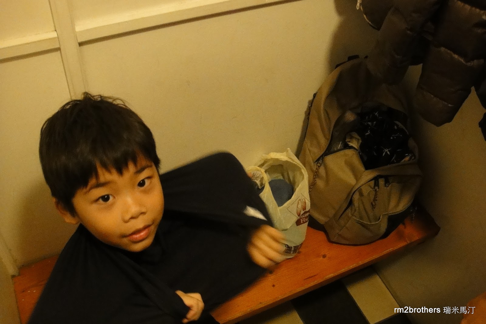 看馬汀弟弟剛剛在水裡面還玩得很開心,一出水面即使穿好了衣服,臉還是很僵。